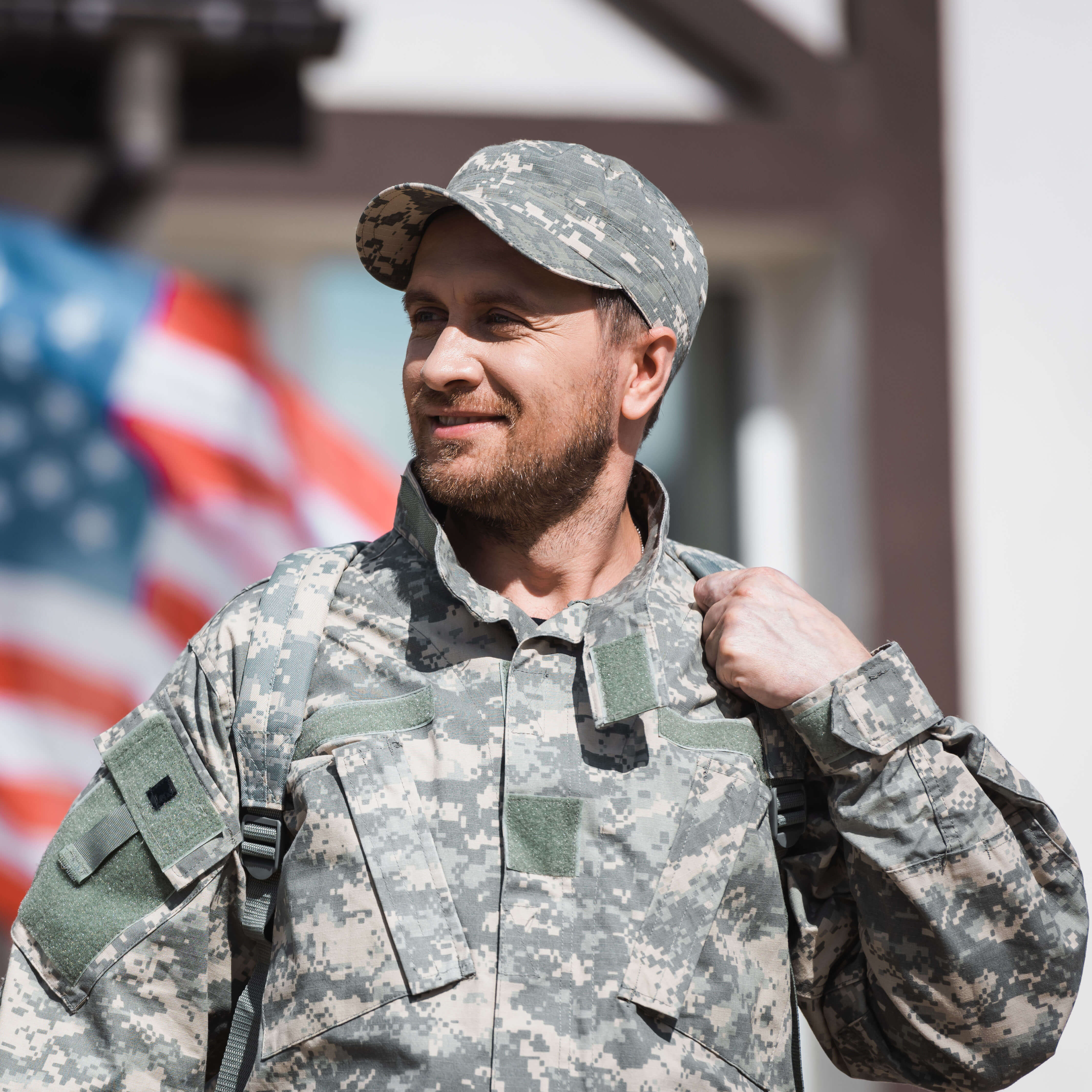 Smiling military veteran in camouflage looking away with blurred american flag on background