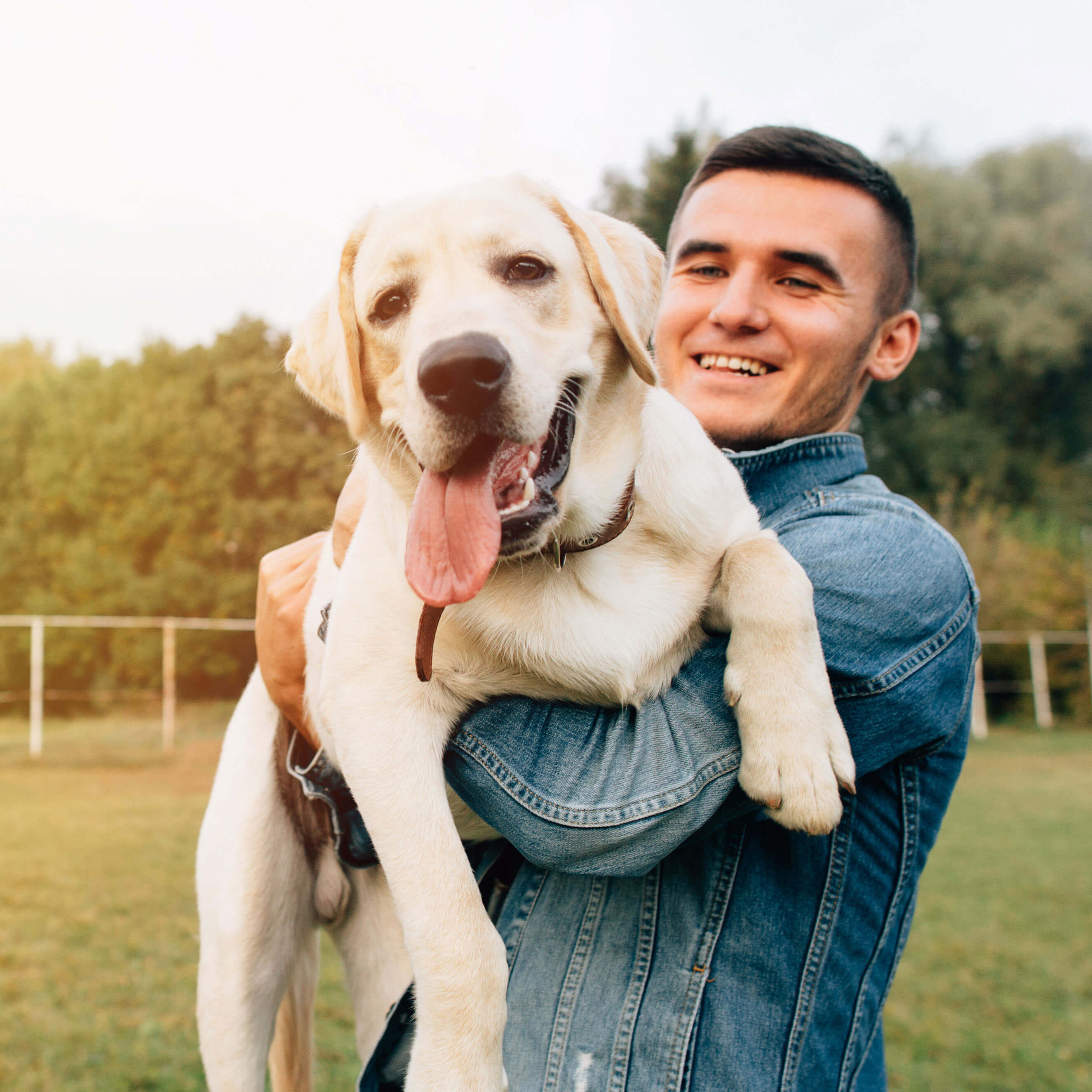 Portrait of happy man holding his friend dog labrador at sunset in park