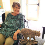 Paulette, a member of the Made in Montana Organization, has been painting such statues for over 15 years. Her projects adorn the Aspen Grove lobby, and her artistry has become a center of the community as residents check in on her progress and look forward to seeing what animal will join the line-up which already includes a bear, a bobcat, an eagle, a big-horn ram, and various other local creatures, as well as a gunman resting on a cliff.